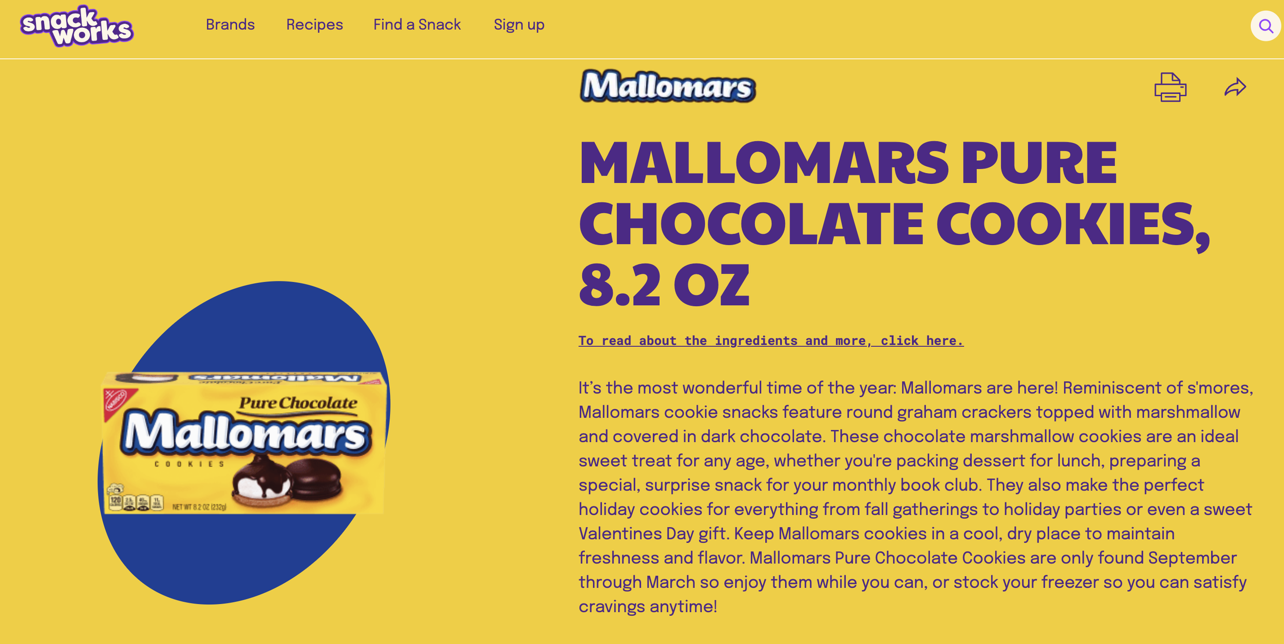 It’s the most wonderful time of the year: Mallomars are here! Reminiscent of s'mores, Mallomars cookie snacks feature round graham crackers topped with marshmallow and covered in dark chocolate. These chocolate marshmallow cookies are an ideal sweet treat for any age, whether you're packing dessert for lunch, preparing a special, surprise snack for your monthly book club. They also make the perfect holiday cookies for everything from fall gatherings to holiday parties or even a sweet Valentines Day gift. Keep Mallomars cookies in a cool, dry place to maintain freshness and flavor. Mallomars Pure Chocolate Cookies are only found September through March so enjoy them while you can, or stock your freezer so you can satisfy cravings anytime!